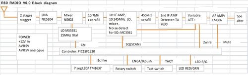 R80V6.の制御はPIC18F1320マイコンですが、ソースはオープンではありません。 そのR80V6の出来ですが、感度抜群でハンディスキャナに迫る耳の良さす。しかしながら、周波数表示と操作性に難あり、更にスケルチいまいち。 Block diagram そこで、RF部を生かし…